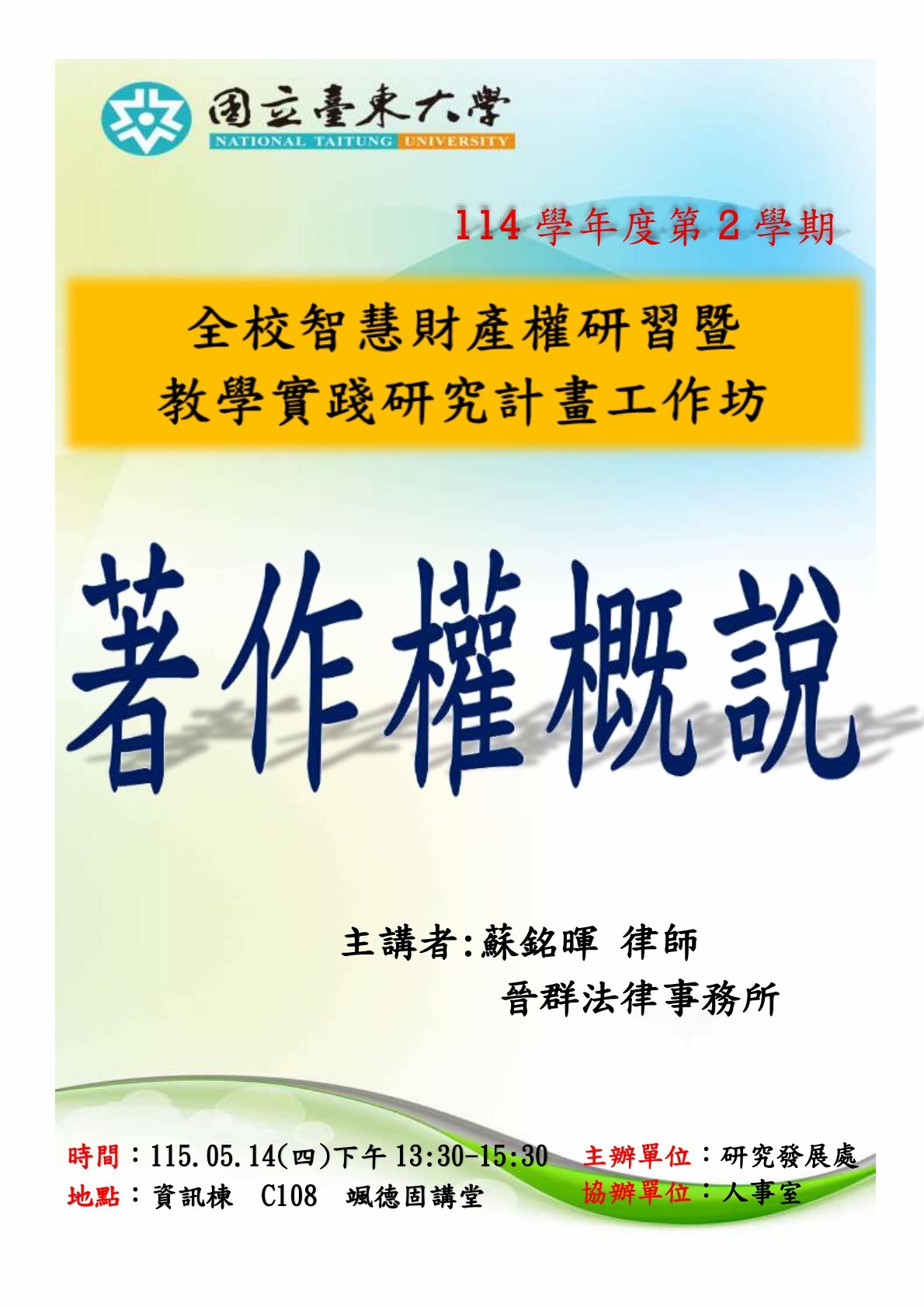 【研發處】114學年度第2學期舉辦本校智慧財產權研習啟事。